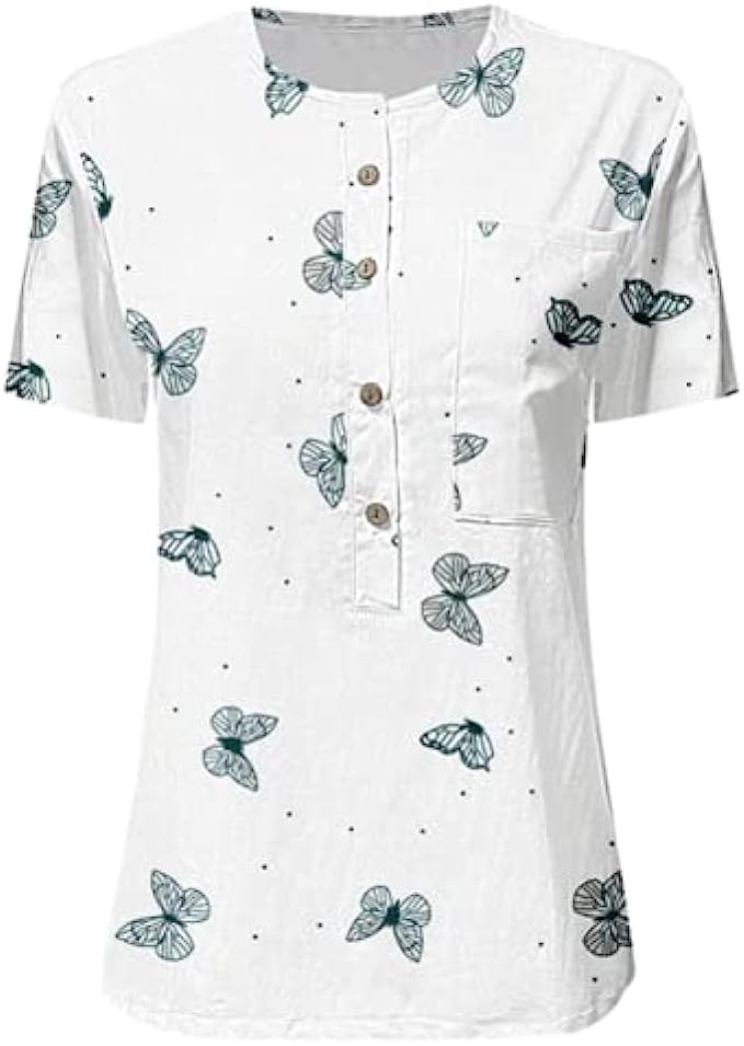 • High-quality polyester+spandex material, unique design, which combines V-neck, front button shirt and comfortable printed short-sleeved shirt. Breathable and opaque, loose and elegant, refreshing in summer! If you like to be loose, you can choose a bigger size.