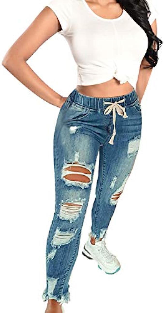 KUNMI Women High Waist Skinny Stretch Ripped Jeans Destroyed Denim Pants Plus Size